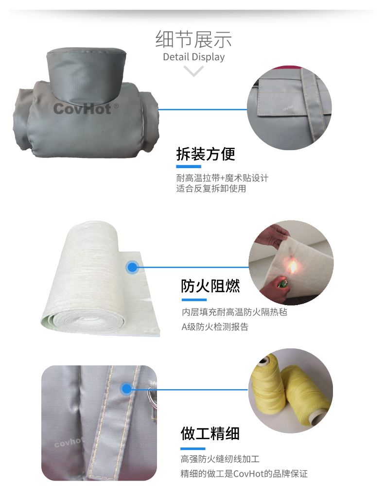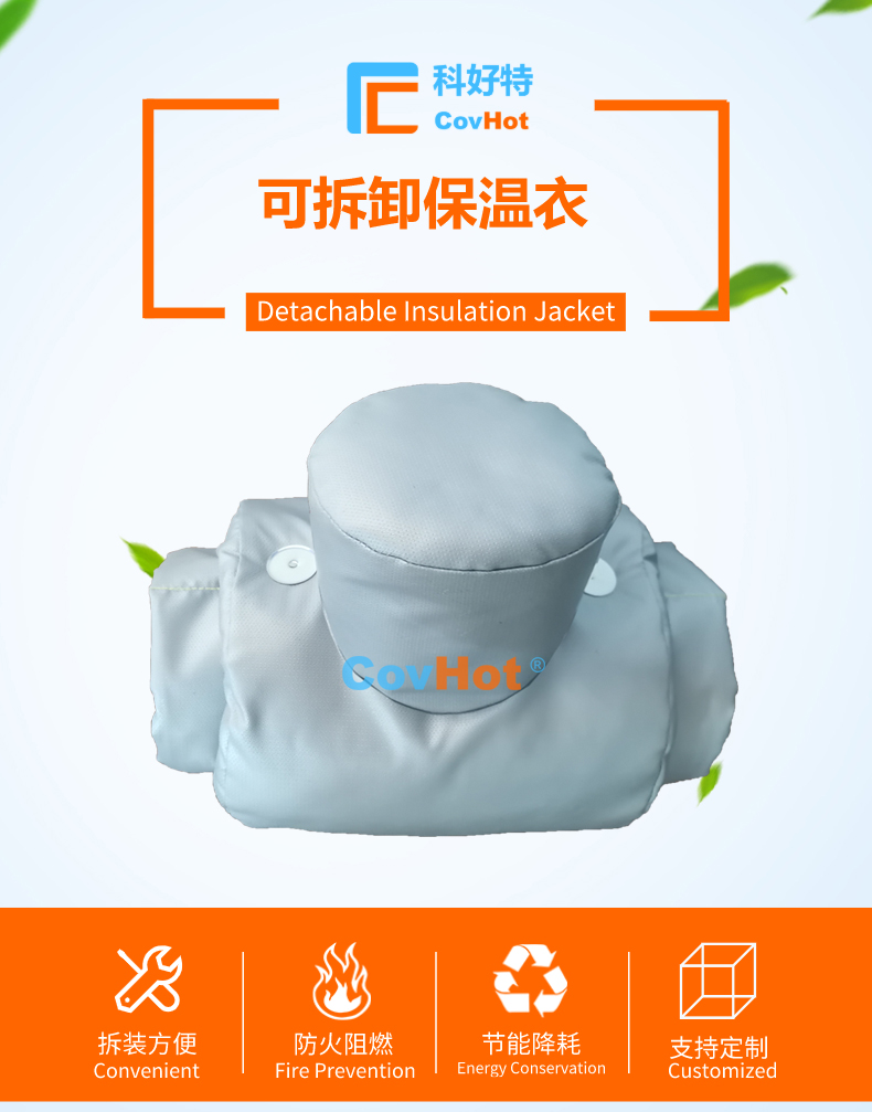 閥門內(nèi)部介質(zhì)通常為各種化工原料,柔性可拆卸閥門保溫套使用的材料可防火阻燃,能夠有效防止因介質(zhì)泄露引起的火災(zāi) ,另外閥門運(yùn)行時(shí)溫度較高,易受熱膨脹,“披覆保溫”原材料柔韌性較好,能夠?qū)﹂y門的膨脹進(jìn)行補(bǔ)償,不會(huì)出現(xiàn)保溫性能下降現(xiàn)象,有利于閥門機(jī)組安全運(yùn)行,大大提高設(shè)備運(yùn)轉(zhuǎn)率,增加經(jīng)濟(jì)效益;
