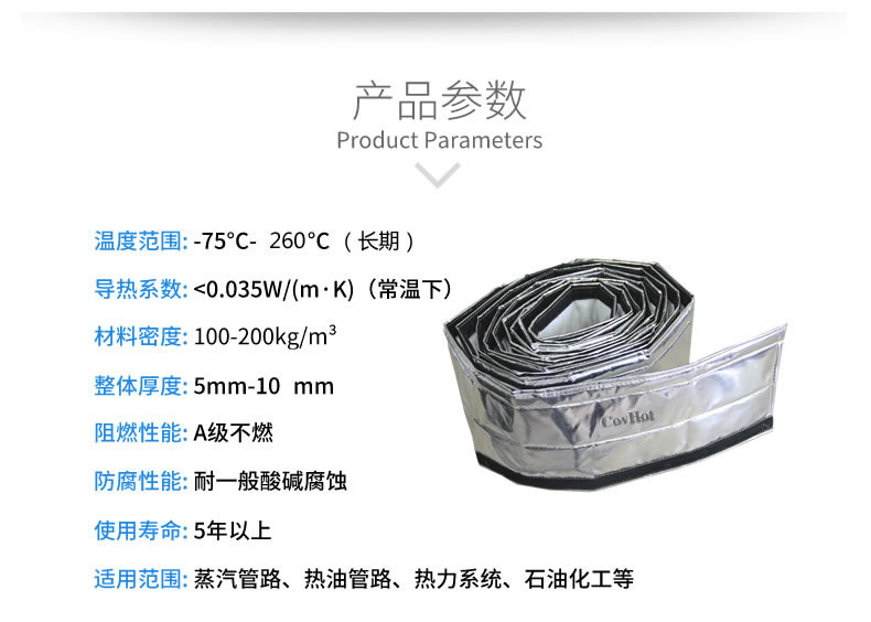 Covhot自粘式保溫帶產品作為方便拆卸的保溫隔熱產品,具有耐高溫、導熱系數低、耐酸堿、防火阻燃能力。